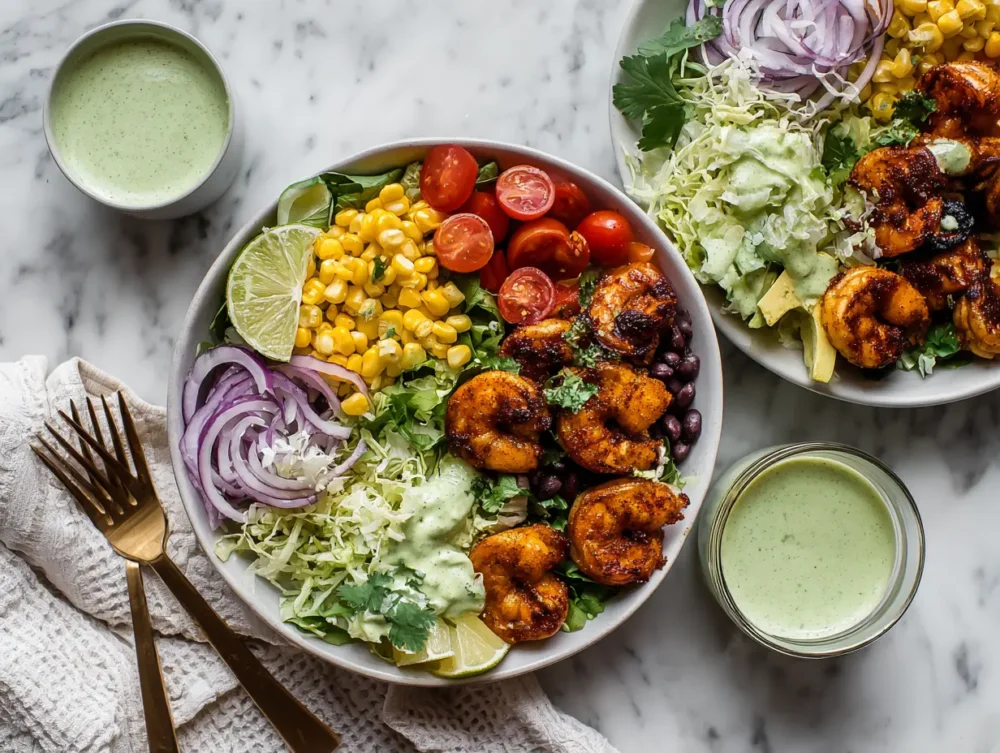- Assemble the bowls:Divide the base (rice, quinoa, or greens) into bowls. Top with shrimp, avocado, tomatoes, cabbage, pickled onions, and corn.