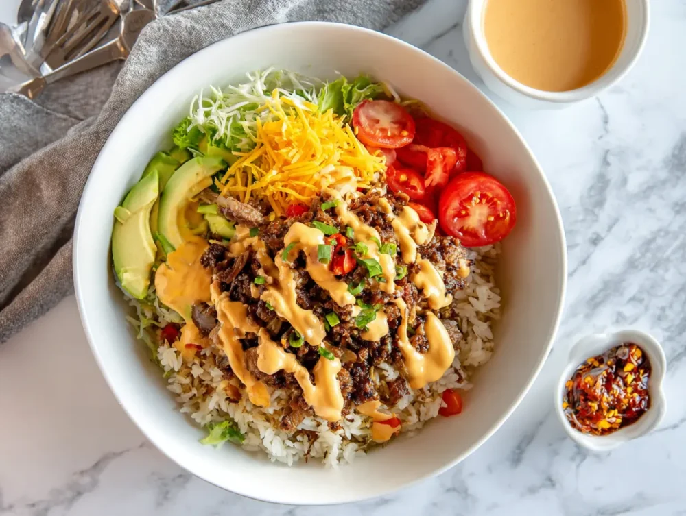 From perfectly seasoned ground beef over fluffy rice to the vibrant toppings and rich sauces, every element of a burger bowl is designed to satisfy. It’s meal prep-friendly, easy to personalize, and ideal for both weeknight dinners and weekend cravings.