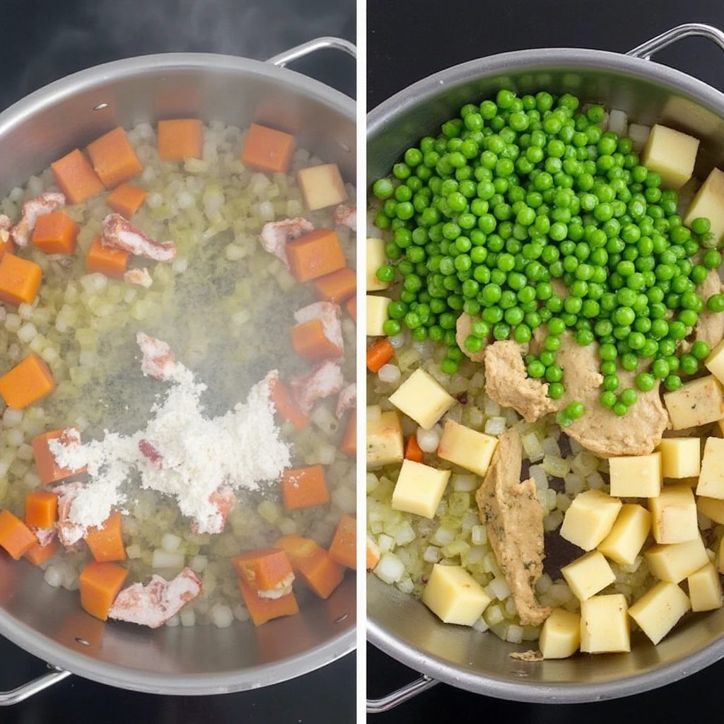 - In a large skillet, melt butter over medium heat. Add onions, garlic, carrots, celery, and peas. Sauté for 5 minutes until softened.